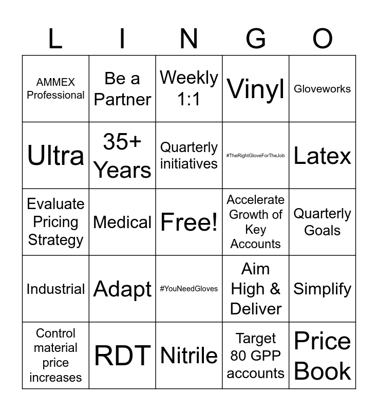 This bingo card has a free space and 24 words: Control material price increases, Adapt, Quarterly initiatives, Target 80 GPP accounts, Gloveworks, AMMEX Professional, Be a Partner, Weekly 1:1, Accelerate Growth of Key Accounts, Quarterly Goals, Evaluate Pricing Strategy, 35+ Years, Aim High & Deliver, Simplify, Ultra, RDT, Nitrile, Vinyl, Latex, Industrial, Medical, #YouNeedGloves, #TheRightGloveForTheJob and Price Book.