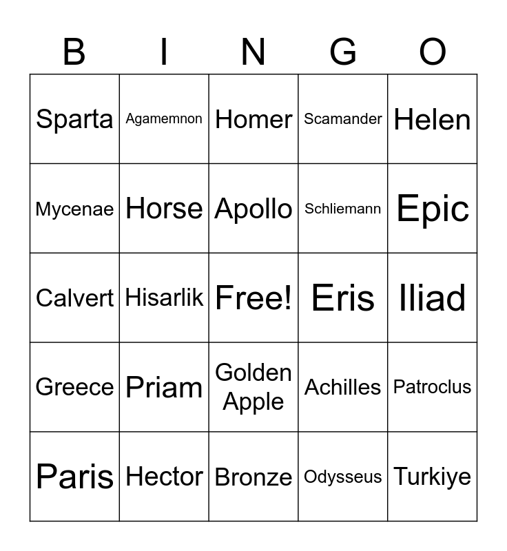This bingo card has a free space and 24 words: Priam, Hector, Apollo, Paris, Helen, Sparta, Mycenae, Agamemnon, Eris, Golden Apple, Schliemann, Calvert, Achilles, Patroclus, Horse, Odysseus, Iliad, Homer, Epic, Hisarlik, Turkiye, Greece, Scamander and Bronze.