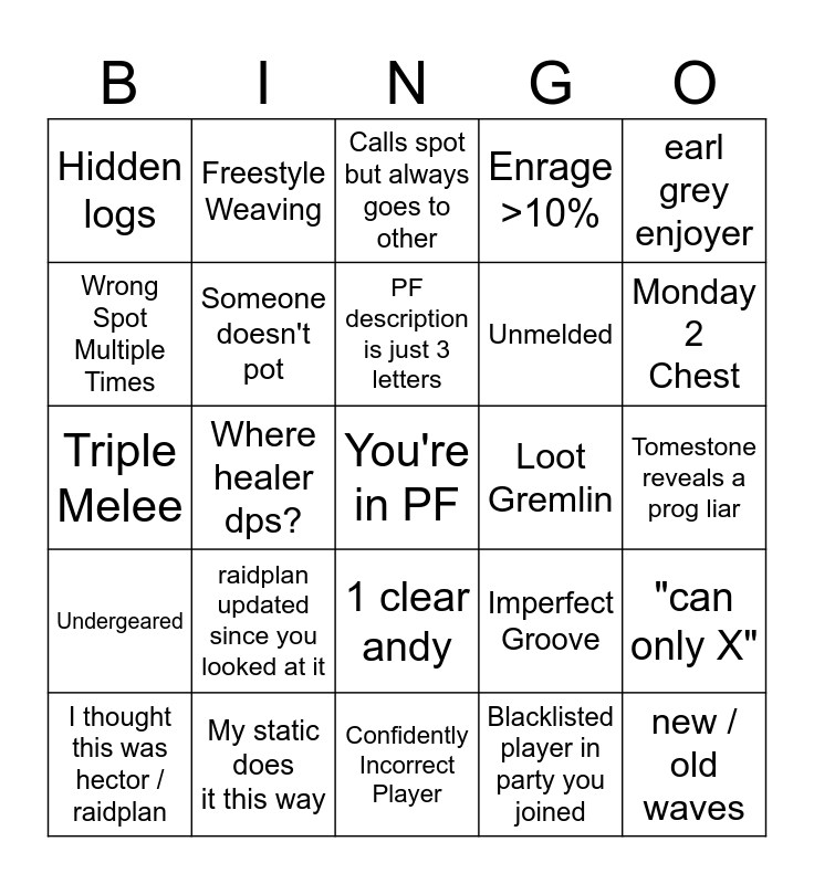 This bingo card has a free space and 27 words: Imperfect Groove, One Guy holding the party hostage, Unmelded, Confidently Incorrect Player, Wrong Spot Multiple Times, Calls spot but always goes to other, Freestyle Weaving, Undergeared, Loot Gremlin, "can only X", Triple Melee, Enrage >10%, I thought this was hector / raidplan, My static does it this way, Monday 2 Chest, KFF [duty complete], Someone doesn't pot, PF description is just 3 letters, raidplan updated since you looked at it, Hidden logs, Tomestone reveals a prog liar, Blacklisted player in party you joined, Where healer dps?, new / old waves, 1 clear andy, earl grey enjoyer and tank doesn't mitigate.