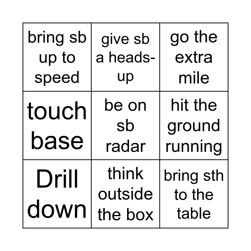 This bingo card has 9 words: Drill down, go the extra mile, give sb a heads-up, touch base, bring sb up to speed, hit the ground running, be on sb radar, bring sth to the table and think outside the box.