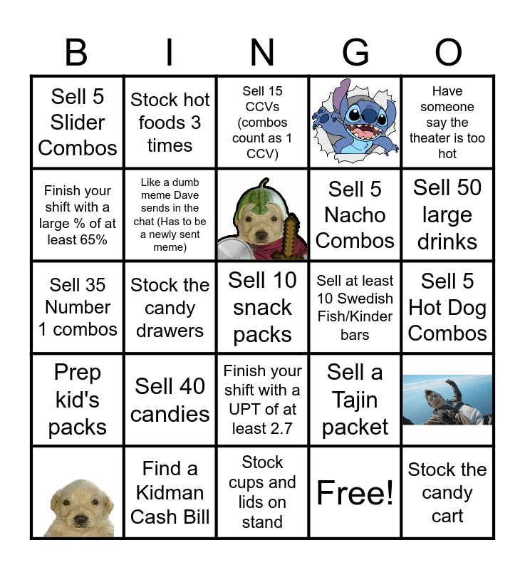 This bingo card has 5 images and 25 words: Find a Kidman Cash Bill, Sweep the stand 5 times, Stock the candy drawers, Wipe down hot foods, Sell 5 Slider Combos, Sell 15 CCVs (combos count as 1 CCV), Like a dumb meme Dave sends in the chat (Has to be a newly sent meme), Finish your shift with a UPT of at least 2.7, Sell at least 10 Swedish Fish/Kinder bars, Stock cups and lids on stand, Sell 5 Hot Dog Combos, Sell 10 snack packs, Free!, Stock the candy cart, Sell 50 large drinks, Sell 1 of the Hawaiian Dippin Dots, Sell a Tajin packet, Prep kid's packs, Sell 40 candies, Have someone say the theater is too hot, Sell 35 Number 1 combos, Wipe down the counters, Stock hot foods 3 times, Sell 5 Nacho Combos and Finish your shift with a large % of at least 65%.