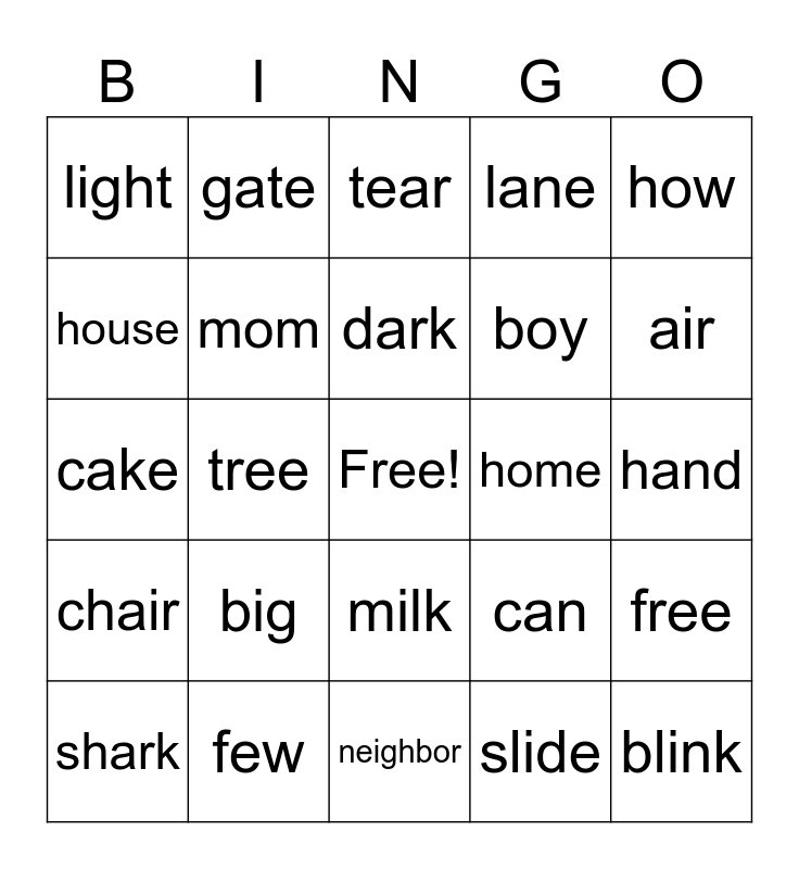 This bingo card has a free space and 24 words: big, few, dark, shark, how, light, house, gate, home, milk, boy, cake, can, free, mom, slide, hand, tear, air, tree, blink, chair, lane and neighbor.