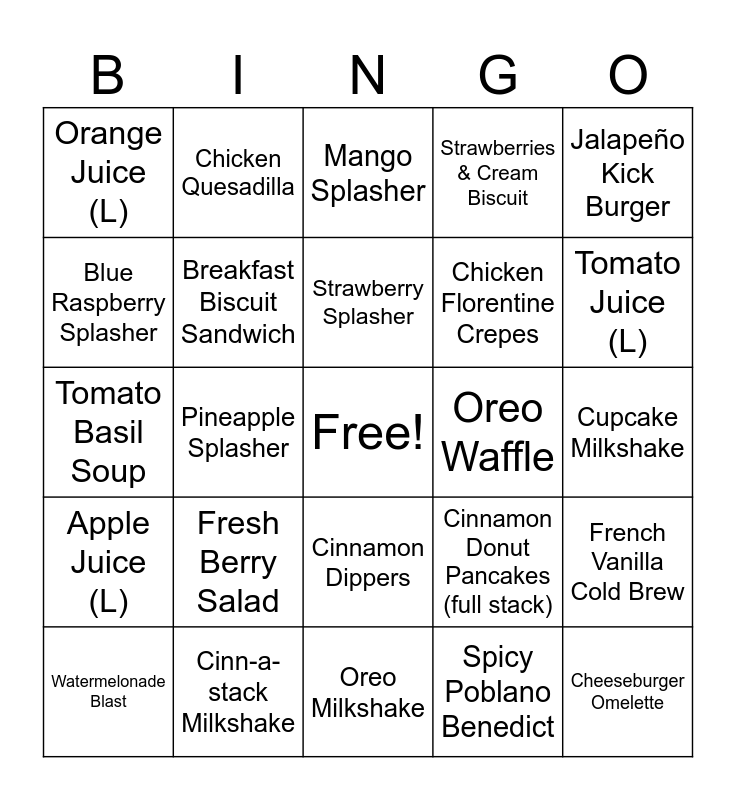 This bingo card has a free space and 24 words: Fresh Berry Salad, Cinn-a-stack Milkshake, Strawberry Splasher, Watermelonade Blast, Jalapeño Kick Burger, Orange Juice (L), Blue Raspberry Splasher, Chicken Quesadilla, Oreo Waffle, Cinnamon Dippers, Chicken Florentine Crepes, Tomato Basil Soup, Cinnamon Donut Pancakes (full stack), French Vanilla Cold Brew, Breakfast Biscuit Sandwich, Spicy Poblano Benedict, Cupcake Milkshake, Mango Splasher, Tomato Juice (L), Pineapple Splasher, Cheeseburger Omelette, Apple Juice (L), Strawberries & Cream Biscuit and Oreo Milkshake.