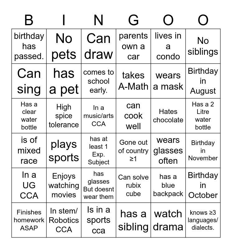 This bingo card has 36 words: Can solve rubix cube, has glasses But doesnt wear them, has a sibling, Can sing, is of mixed race, can cook well, has a pet, Is in a sports cca, lives in a condo, has a blue backpack, Birthday in August, parents own a car, Birthday in October, High spice tolerance, takes A-Math, birthday has passed., In a UG CCA, Hates chocolate, Has a clear water bottle, Can draw, In a music/arts CCA, plays sports, Gone out of country ≥1, has at least 1 Exp. Subject, wears glasses often, No pets, wears a mask, In stem/ Robotics CCA, comes to school early., No siblings, knows ≥3 languages/ dialects., Finishes homework ASAP, Birthday in November, Has a 2 Litre water bottle, Enjoys watching movies and watch drama.