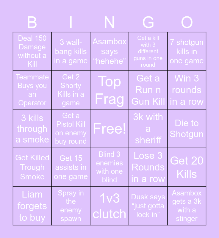 This bingo card has a free space and 44 words: Dusk buys an operator round 4, Asambox gets a 3k with a stinger, Bryce sends a “D:” to the enemy team, Liam forgets to buy, Bryce forgets to buy shields, Dusk says “just gotta lock in”, Asambox says “hehehe”, Liam buys up on the bonus round, 7 shotgun kills in one game, Spray in the enemy spawn, Get a kill with 3 different guns in one round, 3k with a sheriff, Blind 3 enemies with one blind, Get 15 assists in one game, 2.0 kd, 1v3 clutch, Ace, 3 kills through a smoke, Defuse with enemies alive, Win 3 rounds in a row, 3 wall-bang kills in a game, Win a round without walking, Full Buy with No Armor and Win the Round, Deal 150 Damage without a Kill, Defuse with Enemies Alive, Die to Shotgun, Die to Ability, Die to Spike, Lose 3 Rounds in a row, Get Killed Trough Smoke, Get team flashed, Get 20 Kills, Get 3 Kills in a Round, Get a Wall-Bang Kill, Get a Pistol Kill on enemy buy round, Get 5 First Bloods, Waste ult, Kill with an Ability, Top Frag, Teammate Buys you an Operator, Get a Run n Gun Kill, Get a Kill after Round Ends, Get 2 Shorty Kills in a game and Get a Knife Kill.