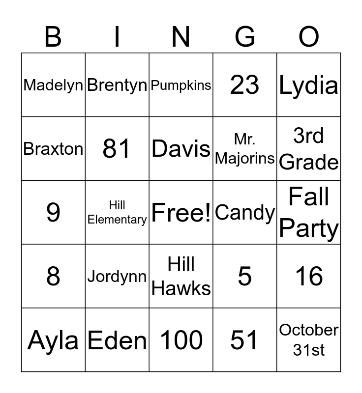 This bingo card has a free space and 24 words: Jordynn, Eden, Davis, Ayla, Lydia, Madelyn, Braxton, Brentyn, Candy, Hill Hawks, Mr. Majorins, 9, 5, 16, 81, 51, Fall Party, Pumpkins, 3rd Grade, Hill Elementary, October 31st, 8, 23 and 100.