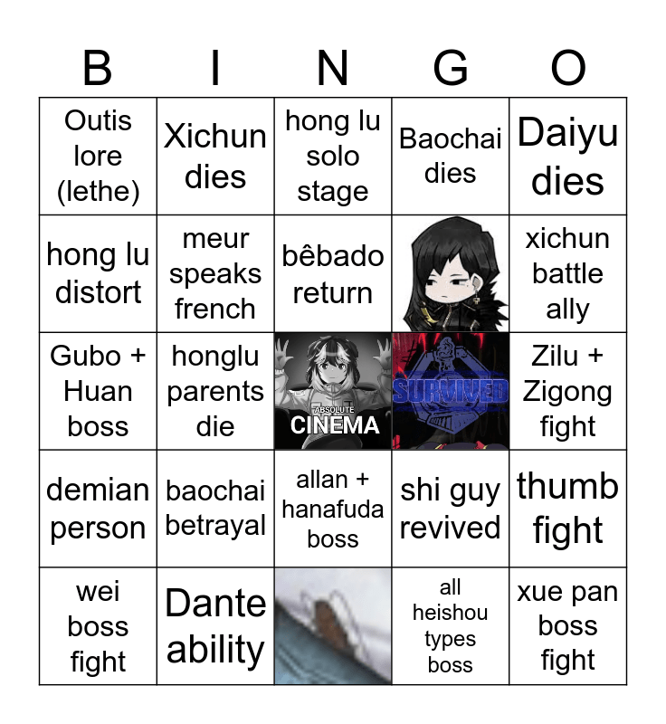 This bingo card has 3 images, a free space and 21 words: baochai betrayal, Dante ability, bêbado return, wei boss fight, Daiyu dies, Outis lore (lethe), hong lu distort, Xichun dies, allan + hanafuda boss, Gubo + Huan boss, shi guy revived, thumb fight, meur speaks french, all heishou types boss, Zilu + Zigong fight, hong lu solo stage, xichun battle ally, honglu parents die, xue pan boss fight, demian person and Baochai dies.