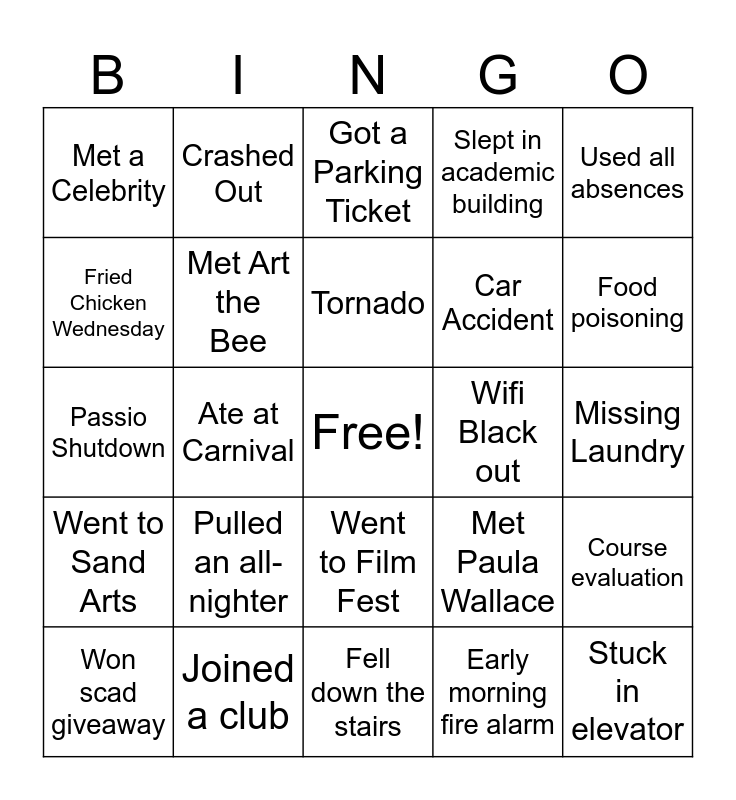 This bingo card has a free space and 30 words: Joined a club, Lost ID, Ate at Carnival, Seen the Dancing Girl, Met a Celebrity, Got a Parking Ticket, Met Art the Bee, Went to Film Fest, Wifi Black out, Fell down the stairs, Missing Laundry, Stuck in elevator, Early morning fire alarm, Class waitlist, Food poisoning, Housing crisis, Met Paula Wallace, Went to Sand Arts, Pulled an all-nighter, Used all absences, Passio Shutdown, Bee Welll, Crashed Out, Car Accident, Fried Chicken Wednesday, Slept in academic building, Course evaluation, Won scad giveaway, Tornado and Been apart of Scad drama.