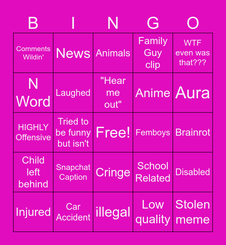This bingo card has a free space and 24 words: Snapchat Caption, Car Accident, "Hear me out", Injured, WTF even was that???, Comments Wildin', N Word, News, Femboys, Cringe, Anime, HIGHLY Offensive, School Related, Disabled, Laughed, Low quality, Brainrot, Animals, Aura, Tried to be funny but isn't, Stolen meme, Child left behind, Family Guy clip and illegal.