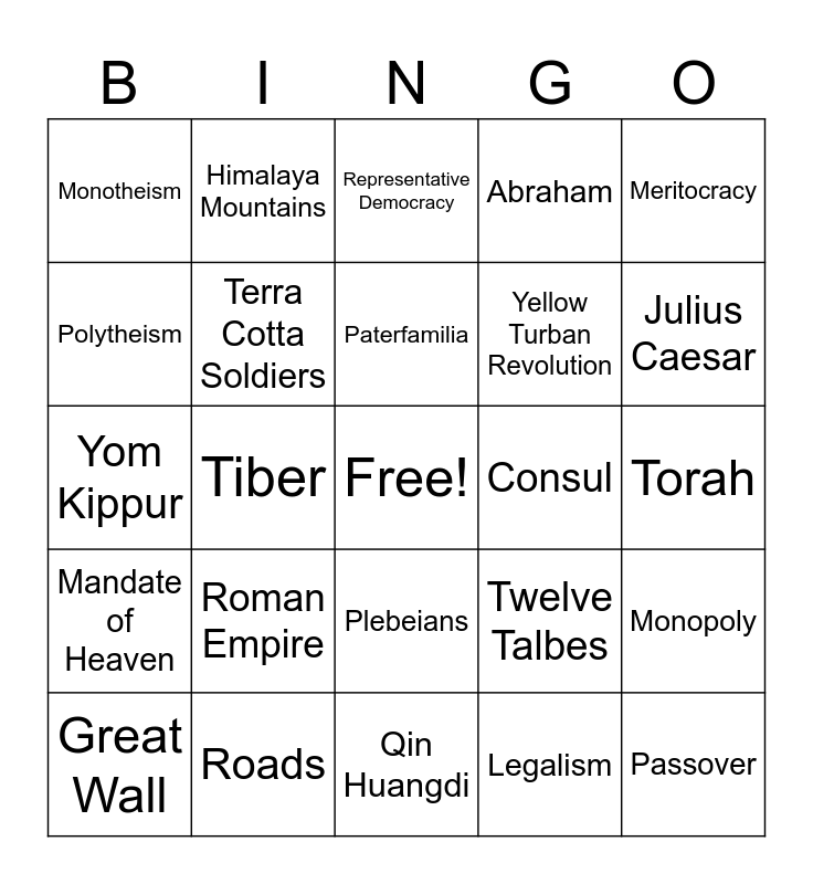 This bingo card has a free space and 34 words: Silk Road, Legalism, Daoism, Confucianism, Mandate of Heaven, Terra Cotta Soldiers, Meritocracy, Great Wall, Himalaya Mountains, Gobi Desert, Paterfamilia, Representative Democracy, Aqueducts, Pax Romana, Consul, Julius Caesar, Roads, Yom Kippur, Roman Empire, Twelve Talbes, Plebeians, Patricians, Monotheism, Torah, Qin Huangdi, Passover, Abraham, Pompeii, Yellow Turban Revolution, Polytheism, Breastplate, Tiber, Monopoly and Spread of culture.