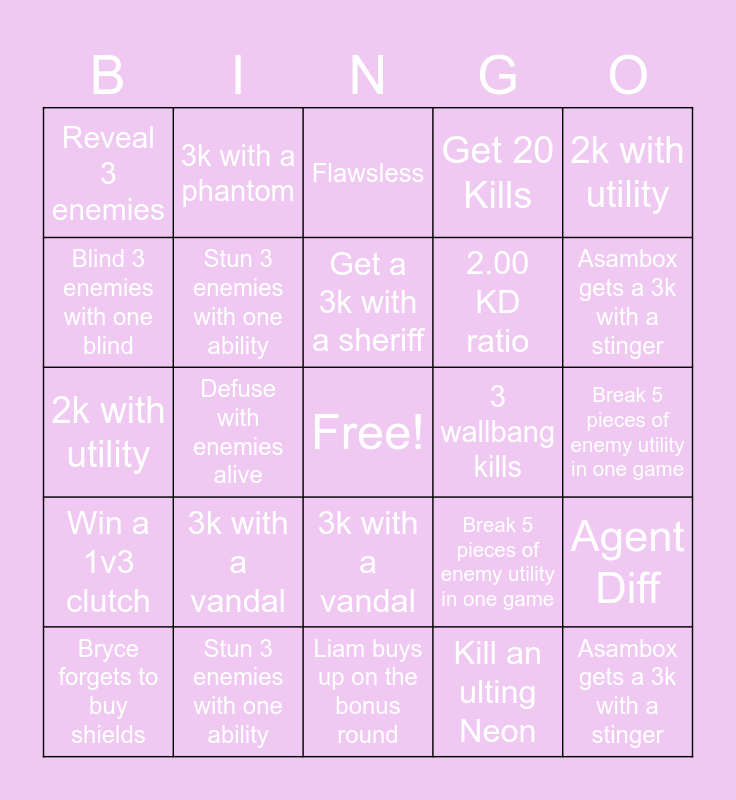 This bingo card has a free space and 48 words: Dusk buys an operator before round 6, Asambox gets a 3k with a stinger, Bryce forgets to buy shields, Liam buys up on the bonus round, 3k with a vandal, Win a 1v3 clutch, 3k with a phantom, Get a 2k with shotguns, Blind 3 enemies with one blind, Defuse the spike 5 times in one game, Stun 3 enemies with one ability, Get 20 Kills, Agent Diff, Break 5 pieces of enemy utility in one game, “Agent” diff your opponent, Defuse without killing all the enemies, Get a 3k with a sheriff, 3 wallbang kills, Top Frag, 2k with utility, Defuse with enemies alive, Kill an ulting Neon, Reveal 3 enemies, 2.00 KD ratio, Dusk buys an operator before round 6, Asambox gets a 3k with a stinger, Bryce forgets to buy shields, Liam buys up on the bonus round, 3k with a vandal, Win a 1v3 clutch, 3k with a phantom, Get a 2k with shotguns, Blind 3 enemies with one blind, Defuse the spike 5 times in one game, Stun 3 enemies with one ability, Get 20 Kills, Agent Diff, Break 5 pieces of enemy utility in one game, Win a round without walking, Defuse without killing all the enemies, Get a 3k with a sheriff, 3 wallbang kills, Flawsless, Top Frag, 2k with utility, Kill an ulting Neon, Reveal 3 enemies and 2.00 KD ratio.
