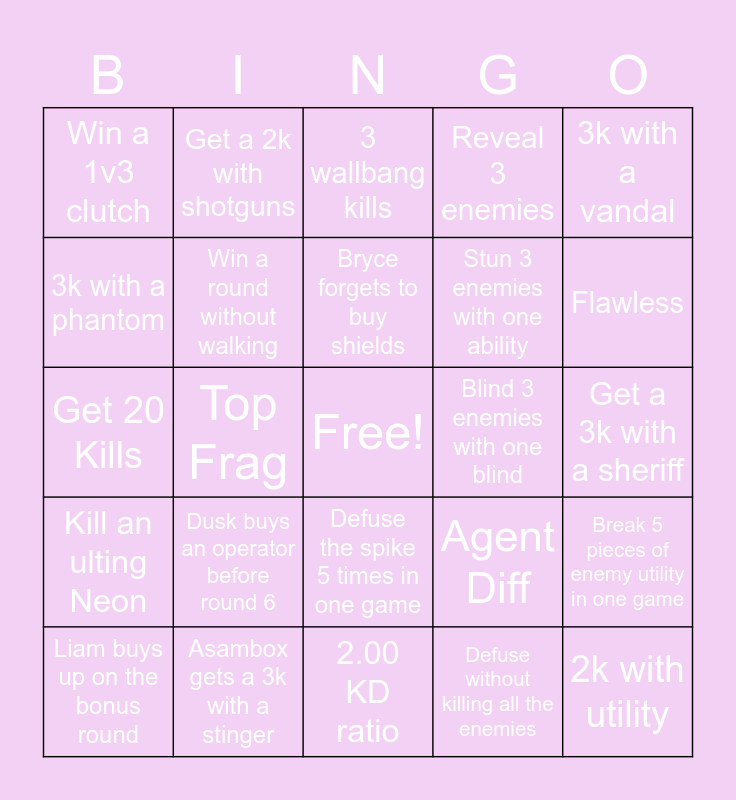 This bingo card has a free space and 24 words: Dusk buys an operator before round 6, Asambox gets a 3k with a stinger, Bryce forgets to buy shields, Liam buys up on the bonus round, 3k with a vandal, Win a 1v3 clutch, 3k with a phantom, Get a 2k with shotguns, Blind 3 enemies with one blind, Defuse the spike 5 times in one game, Stun 3 enemies with one ability, Get 20 Kills, Agent Diff, Break 5 pieces of enemy utility in one game, Win a round without walking, Defuse without killing all the enemies, Get a 3k with a sheriff, 3 wallbang kills, Flawless, Top Frag, 2k with utility, Kill an ulting Neon, Reveal 3 enemies and 2.00 KD ratio.