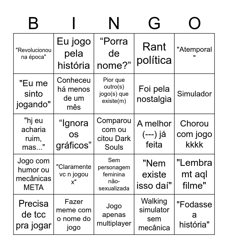 This bingo card has 25 words: "Claramente vc n jogou x", Jogo apenas multiplayer, Pior que outro(s) jogo(s) que existe(m), Precisa de tcc pra jogar, "Atemporal ", "Revolucionou na época", "Eu me sinto jogando", Eu jogo pela história, A melhor (---) já feita, Sem personagem feminina não-sexualizada, Foi pela nostalgia, "hj eu acharia ruim, mas...", "Nem existe isso daí", "Lembra mt aql filme", Conheceu há menos de um mês, "Fodasse a história", Chorou com jogo kkkk, “Porra de nome?”, Simulador, “Ignora os gráficos”, Comparou com ou citou Dark Souls, Fazer meme com o nome do jogo, Jogo com humor ou mecânicas META, Rant política and Walking simulator sem mecânica.