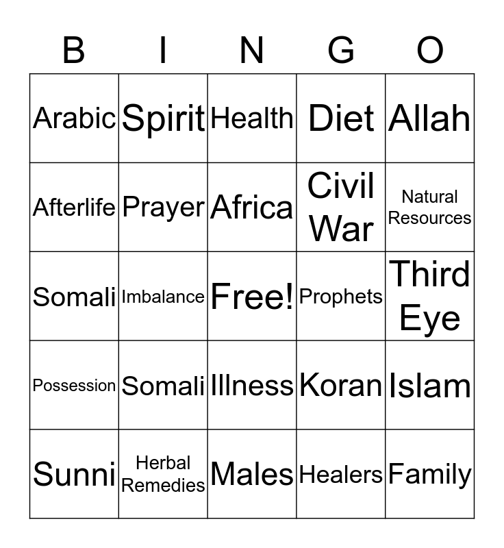 This bingo card has a free space and 24 words: Somali, Herbal Remedies, Africa, Sunni, Allah, Arabic, Afterlife, Spirit, Prophets, Illness, Civil War, Somali, Koran, Islam, Prayer, Healers, Third Eye, Health, Natural Resources, Imbalance, Family, Possession, Diet and Males.