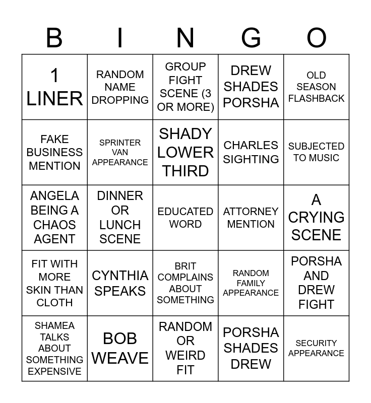 This bingo card has a free space and 24 words: CYNTHIA SPEAKS, BOB WEAVE, SHADY LOWER THIRD, SHAMEA TALKS ABOUT SOMETHING EXPENSIVE, OLD SEASON FLASHBACK, 1 LINER, FAKE BUSINESS MENTION, RANDOM NAME DROPPING, ATTORNEY MENTION, BRIT COMPLAINS ABOUT SOMETHING, CHARLES SIGHTING, ANGELA BEING A CHAOS AGENT, RANDOM FAMILY APPEARANCE, PORSHA AND DREW FIGHT, SPRINTER VAN APPEARANCE, PORSHA SHADES DREW, A CRYING SCENE, GROUP FIGHT SCENE (3 OR MORE), SUBJECTED TO MUSIC, DINNER OR LUNCH SCENE, SECURITY APPEARANCE, FIT WITH MORE SKIN THAN CLOTH, DREW SHADES PORSHA and RANDOM OR WEIRD FIT.