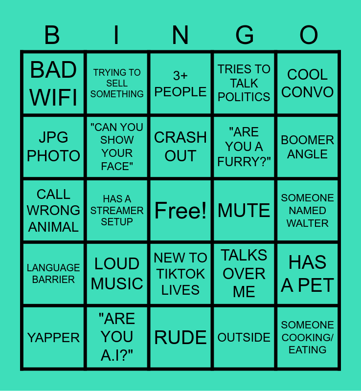 This bingo card has a free space and 24 words: LOUD MUSIC, "ARE YOU A.I?", CRASH OUT, YAPPER, COOL CONVO, BAD WIFI, JPG PHOTO, TRYING TO SELL SOMETHING, MUTE, NEW TO TIKTOK LIVES, "ARE YOU A FURRY?", CALL WRONG ANIMAL, TALKS OVER ME, HAS A PET, "CAN YOU SHOW YOUR FACE", OUTSIDE, SOMEONE NAMED WALTER, 3+ PEOPLE, BOOMER ANGLE, HAS A STREAMER SETUP, SOMEONE COOKING/ EATING, LANGUAGE BARRIER, TRIES TO TALK POLITICS and RUDE.