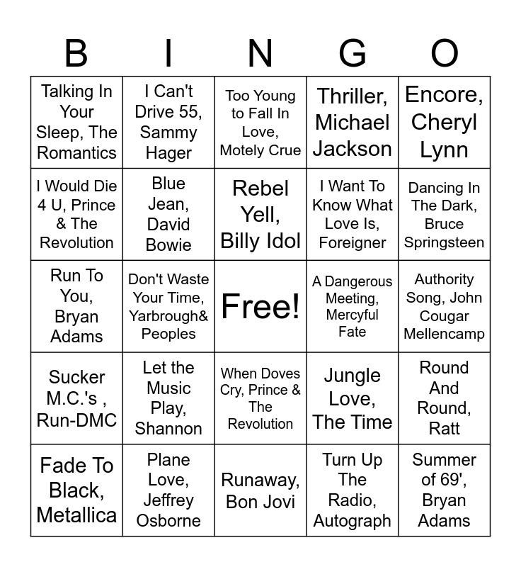 This bingo card has a free space and 84 words: Jump, Van Halen, Looks That Kill, Motely Crue, Rebel Yell, Billy Idol, I Wanna Be Somebody, W.A.S.P., We're Not Gonna Take It, Twisted Sister, You Might Think, The Cars, Born In The U.S.A., Bruce Springsteen, Sister Christian, Night Ranger, Out of Touch, Daryl Hall & John Oats, Summer of 69', Bryan Adams, I Want to Break Free, Queen, For Whom The Bell Tolls, Metallica, A Dangerous Meeting, Mercyful Fate, Round And Round, Ratt, Rock You Like A Hurricane, Scorpions, I Can't Drive 55, Sammy Hager, Pride, U2, I Want To Know What Love Is, Foreigner, The Boys Of Summer, Done Henley, Oh Sherrie, Steve Perry, The Heart of Rock and Roll, Huey Lewis & The News, Runaway, Bon Jovi, Turn Up The Radio, Autograph, Panama, Van Helen, Talking In Your Sleep, The Romantics, Legs, ZZ Top, On the Dark Side, John Cafferty & The Beaver Brown Brothers, Against All Odds, Phil Collins, Drive, The Cars, Missing You, John Waite, Blue Jean, David Bowie, Cover Me, Bruce Springsteen, That's All, Genesis, Authority Song, John Cougar Mellencamp, Fade To Black, Metallica, Radio Ga Ga, Queen, We Belong, Pat Benatar, I Wanna Rock, Twisted Sister, Dancing In The Dark, Bruce Springsteen, Run To You, Bryan Adams, Eyes Without A Face, Billy Idol, Still Loving You, Scorpions, Mama Weer All Crazzee Now, Quiet Riot, The Last In Line, Dio, Alone Again, Dokken, I'll Wait, Van Halen, Too Young to Fall In Love, Motely Crue, 2 Minutes to Midnight, Iron Maiden, Up Around the Bend, Hanoi Rocks, Heaven's On Fire, Kiss, Perfect Strangers, Deep Purple, When Doves Cry, Prince & The Revolution, Thriller, Michael Jackson, Cool It Now, New Edition, Hello, Lionel Richie, I Just Called to Say I Love You, Stevie Wonder, Let's Hear It For the Boy, Deniece Williams, Jungle Love, The Time, Jump, The Pointer Sisters, I Would Die 4 U, Prince & The Revolution, Solid, Ashford & Simpson, Joanna, Kool & The Gang, Caribbean Queen, Billy Ocean, Friends, Whodini, What's Love Got to Do With It, Tina Turner, Easy Lover, Philip Bailey & Phil Collins, Jam On It, Newcleus, Lovergirl, Teena Marie, Encore, Cheryl Lynn, If Only You Knew, Patti LaBelle, Don't Waste Your Time, Yarbrough& Peoples, Lovelite, O'Bryan, Ghostbusters, Ray Parker Jr, Caribbean Queen, Billy Ocean, Sucker M.C.'s , Run-DMC, Let the Music Play, Shannon, Superstar, Luther Vandross, She's Strange, Cameo, Change of Heart, Change, Mr, Telephone Man, New Edition, Plane Love, Jeffrey Osborne, You Get the Best from Me, Alicia Myers, Roxanne's Revenge, Roxanne Shante and The Glamorous Life, Sheila E.