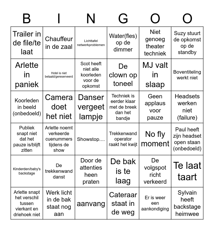 This bingo card has 40 words: aanvang, MJ valt in slaap, Arlette mist cue, Arlette in paniek, Trekkenwand operator raakt het kwijt, Headsets werken niet (failure), Hotel is niet betaald/gereserveerd, Orkest staat in de file, Niet genoeg theater techniek, Techniek is eerder klaar met de breek dan het bandje, Boventiteling werkt niet, Water(fles) op de dimmer, Koorleden in beeld (onbedoeld), Danser vergeet lampje, Camera doet het niet, Geen applaus voor pauze, Te laat taart, Trailer in de file/te laat, Cateraar staat in de weg, Lichttafel netwerkproblemen, Arlette noemt verkeerde cuenummers tijdens de show, Paul heeft zijn headset open staan (onbedoeld), Scot heeft niet alle koorleden voor de opkomst, Suzy stuurt de opkomst op de standby, Er is weer een aankondiging, De bak is te laag, De trekkenwand danst, Sylvain heeft backstage heimwee, Kinderden/baby's backstage, Door de attenties heen praten, Ton in de zaal, Showstop...., Arlette snapt het verschil tussen vierkant en driehoek niet, Publiek snapt niet dat het pauze is/blijft zitten, De clown op toneel, No fly moment, De volgspot richt verkeerd, Werk licht in de bak staat nog aan, Chauffeur in de zaal and Waut zet applaus in en door.