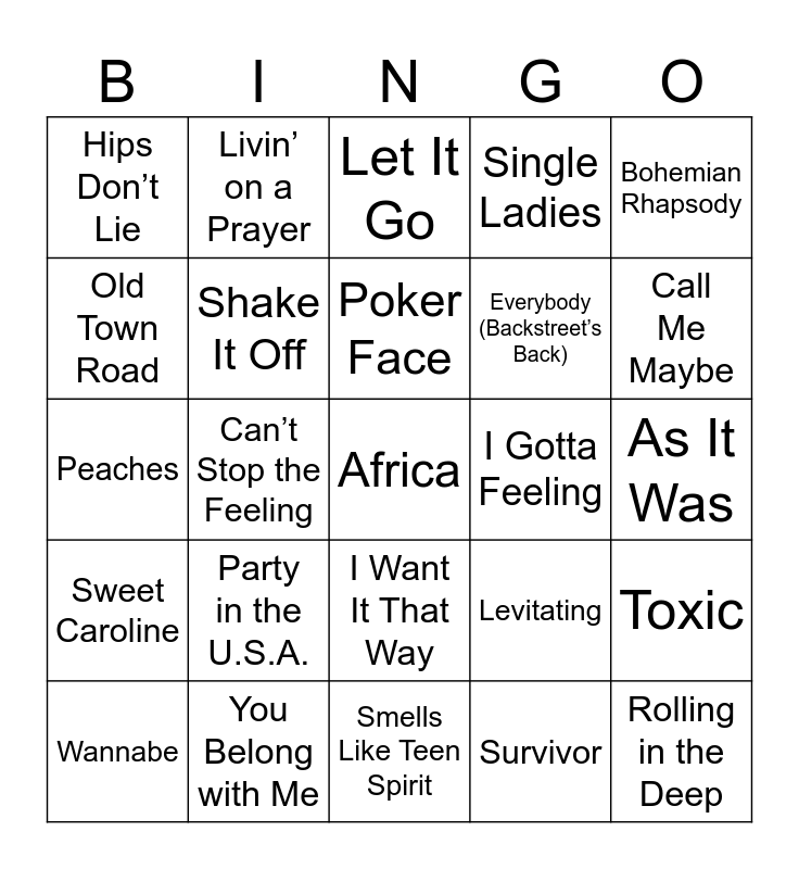 This bingo card has 36 words: Free!, Hey Ya!, Mr. Brightside, Shake It Off, Levitating, Sweet Caroline, Poker Face, I Wanna Dance with Somebody, Bohemian Rhapsody, Don’t Stop Believin’, Can’t Stop the Feeling, Single Ladies, Wonderwall, I Gotta Feeling, Call Me Maybe, Hips Don’t Lie, Rolling in the Deep, Party in the U.S.A., Africa, Let It Go, As It Was, Toxic, You Belong with Me, Wannabe, Smells Like Teen Spirit, Livin’ on a Prayer, Peaches, Take On Me, Everybody (Backstreet’s Back), Old Town Road, Since U Been Gone, Dancing Queen, Survivor, I Want It That Way, Valerie and I’m a Believer.