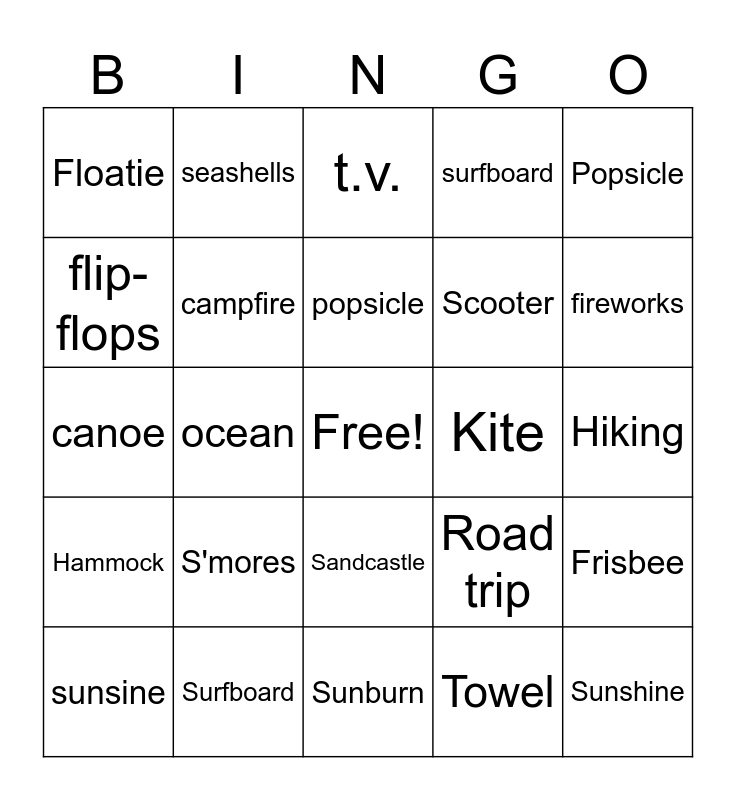 This bingo card has a free space and 74 words: beach, pool, t.v., video games, BBQ, vacation, 100 degrees, sunglasses, sunsine, picnic, ice cream, swim, popsicle, flip-flops, sand, ocean, towel, fireworks, lemonade, canoe, campfire, seashells, surfboard, sunburn, Sunshine, Beach, Pool, Vacation, Ice cream, Swim, Popsicle, Flip-flops, Sunglasses, Sand, Ocean, Towel, Picnic, Barbecue, Fireworks, Lemonade, Sunburn, Surfboard, Seashell, Lifeguard, Swimsuit, Floatie, Campfire, S'mores, Canoe, Lake, Tent, Bug spray, Hiking, Watermelon, Splash, Slide, Sandcastle, Crab, Fishing, Frisbee, Scooter, Bike, Hammock, Paddle, Kite, Boogie board, Sunhat, Sunscreen, Road trip, Breeze, Coconut, Waves, Adventure and Heat.