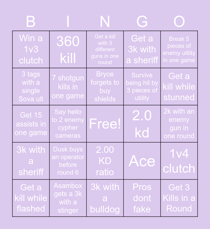This bingo card has a free space and 24 words: Dusk buys an operator before round 6, Asambox gets a 3k with a stinger, Bryce forgets to buy shields, Get a kill while flashed, Break 5 pieces of enemy utility in one game, Win a 1v3 clutch, 3 tags with a single Sova ult, 360 kill, 2.0 kd, 2.00 KD ratio, Survive being hit by 3 pieces of utility, Get 15 assists in one game, Ace, 1v4 clutch, 7 shotgun kills in one game, Pros dont fake, 2k with an enemy gun in one round, Get a kill with 3 different guns in one round, Get a kill while stunned, Say hello to 2 enemy cypher cameras, Get 3 Kills in a Round, 3k with a sheriff, Get a 3k with a sheriff and 3k with a bulldog.