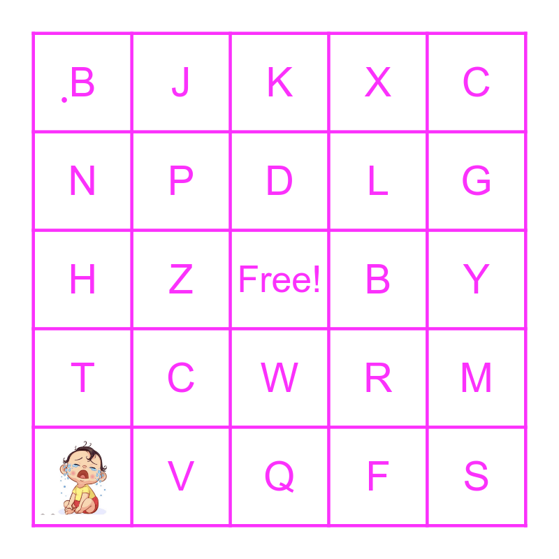 This bingo card has 1 images, a free space and 24 words: C, D, F, G, ฺB, J, K, L, M, H, P, R, S, N, V, Q, X, Y, T, Z, W, B, C and Z.