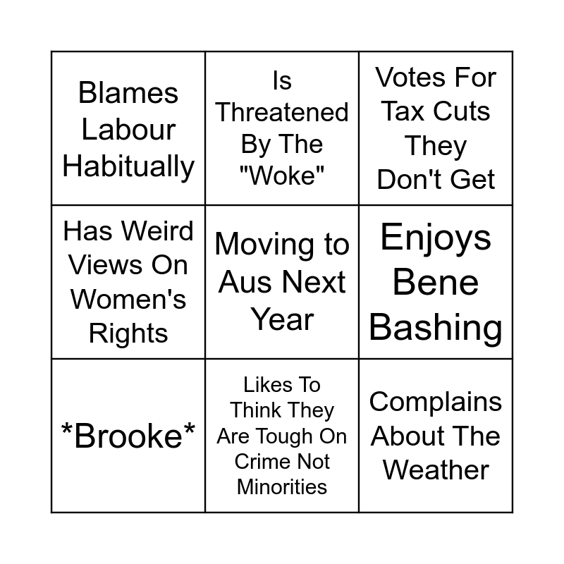 This bingo card has a free space and 8 words: Enjoys Bene Bashing, Votes For Tax Cuts They Don't Get, Is Threatened By The "Woke", *Brooke*, Blames Labour Habitually, Complains About The Weather, Has Weird Views On Women's Rights and Likes To Think They Are Tough On Crime Not Minorities.