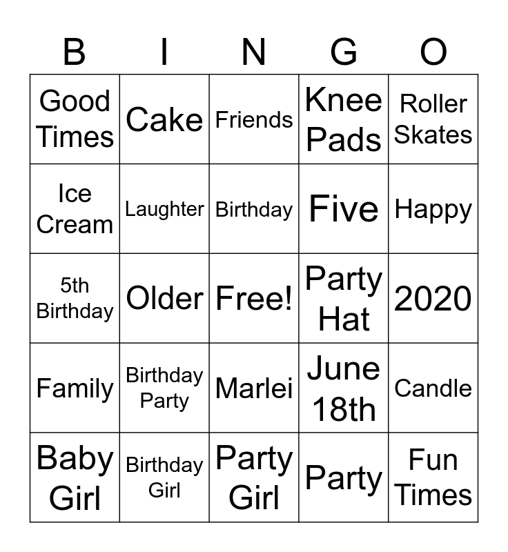 This bingo card has a free space and 26 words: Marlei, Party, Birthday, Birthday Girl, Roller Skates, Good Times, Ice Cream, Cake, 2020, June 18th, Five, 5th Birthday, Candle, Baby Girl, Older, Skates, Knee Pads, Family, Friends, Fun Times, Happy, Party Girl, Party Hat, Birthday Party, Laughter and Let the Good Times Roll.