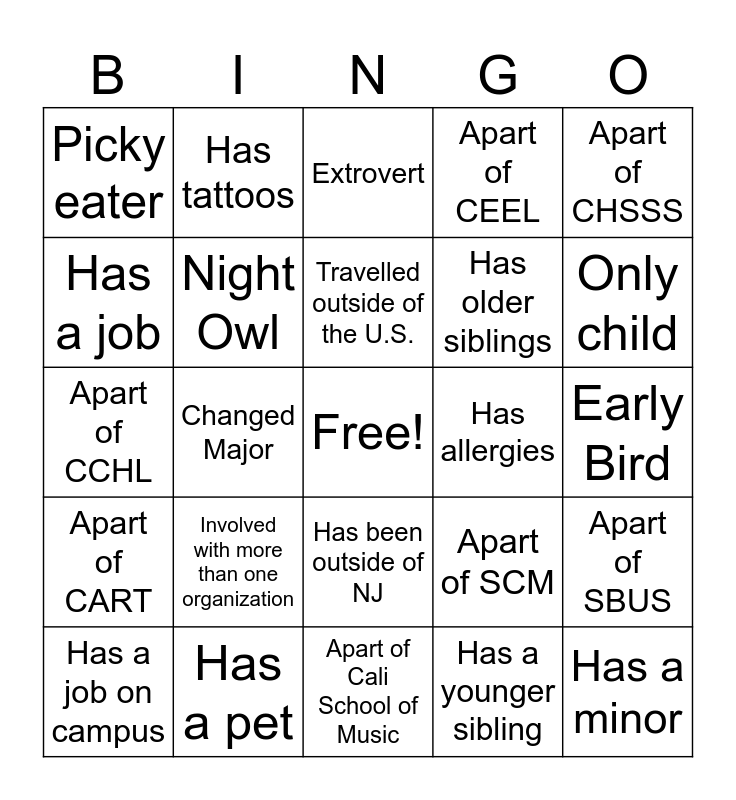 This bingo card has a free space and 24 words: Has a job on campus, Involved with more than one organization, Travelled outside of the U.S., Has a younger sibling, Apart of CHSSS, Picky eater, Has tattoos, Extrovert, Has allergies, Early Bird, Apart of CCHL, Night Owl, Apart of SCM, Apart of SBUS, Has a job, Has a pet, Apart of Cali School of Music, Apart of CEEL, Only child, Apart of CART, Changed Major, Has been outside of NJ, Has older siblings and Has a minor.