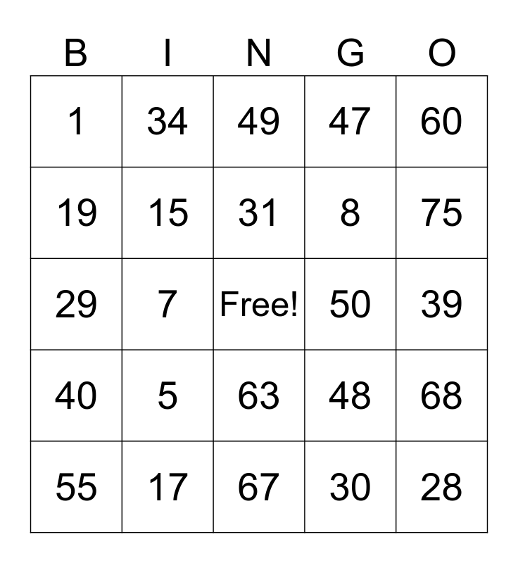 This bingo card has a free space and 24 words: 5, 17, 31, 55, 60, 1, 19, 34, 50, 63, 8, 29, 48, 68, 15, 30, 39, 49, 75, 7, 28, 40, 47 and 67.