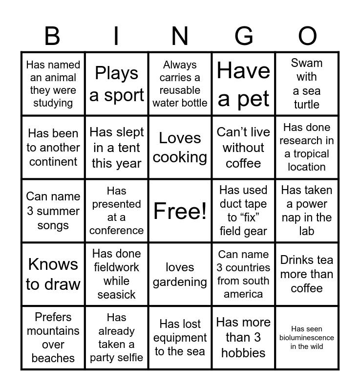 This bingo card has a free space and 24 words: Has done fieldwork while seasick, Has already taken a party selfie, Loves cooking, Prefers mountains over beaches, Swam with a sea turtle, Has named an animal they were studying, Has been to another continent, Plays a sport, Has used duct tape to “fix” field gear, loves gardening, Can’t live without coffee, Can name 3 summer songs, Can name 3 countries from south america, Drinks tea more than coffee, Has slept in a tent this year, Has more than 3 hobbies, Has taken a power nap in the lab, Always carries a reusable water bottle, Has done research in a tropical location, Has presented at a conference, Has seen bioluminescence in the wild, Knows to draw, Have a pet and Has lost equipment to the sea.