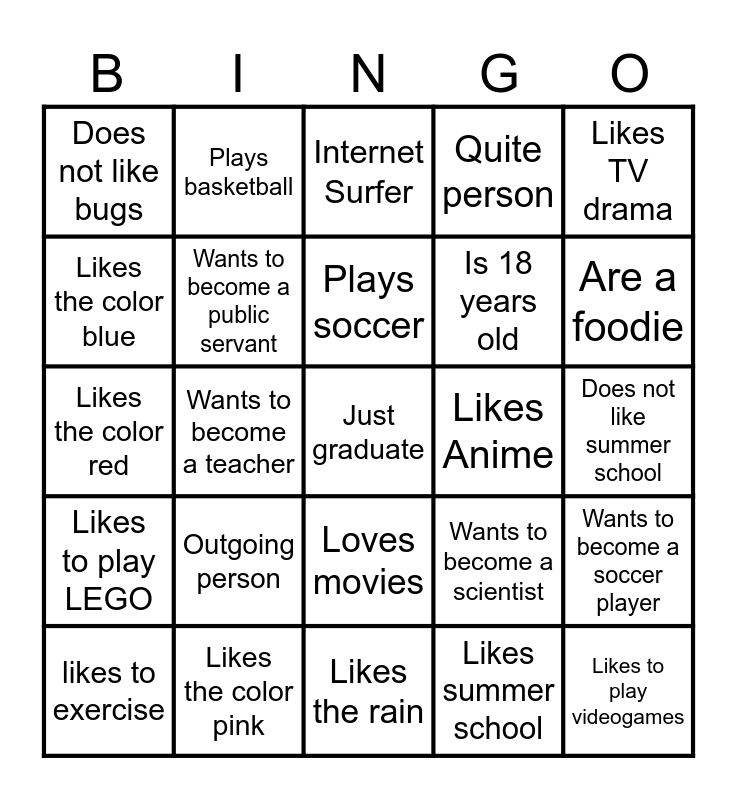 This bingo card has a free space and 24 words: Outgoing person, Likes the color pink, Plays soccer, likes to exercise, Likes TV drama, Does not like bugs, Likes the color blue, Plays basketball, Likes Anime, Loves movies, Is 18 years old, Likes the color red, Wants to become a scientist, Wants to become a soccer player, Wants to become a public servant, Likes summer school, Does not like summer school, Internet Surfer, Are a foodie, Wants to become a teacher, Likes to play videogames, Likes to play LEGO, Quite person and Likes the rain.