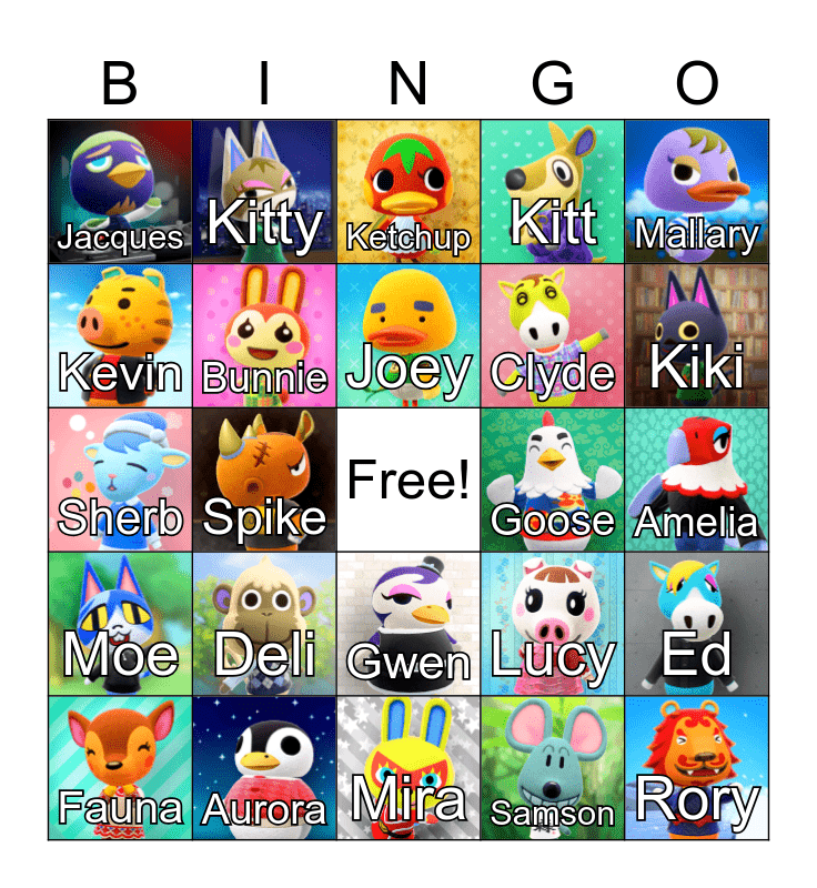 This bingo card has 24 images, a free space and 24 words: Fauna, Deli, Joey, Samson, Mallary, Jacques, Kitty, Ketchup, Goose, Amelia, Sherb, Bunnie, Lucy, Ed, Kevin, Aurora, Mira, Kitt, Kiki, Moe, Spike, Gwen, Clyde and Rory.