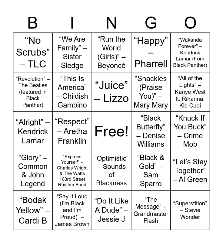 This bingo card has a free space and 40 words: “Before I Let Go” – Maze, “Alright” – Kendrick Lamar, “Formation” – Beyoncé, “This Is America” – Childish Gambino, “Say It Loud (I’m Black and I’m Proud)” – James Brown, “Optimistic” – Sounds of Blackness, “Juice” – Lizzo, “Brown Skin Girl” – Beyoncé, Blue Ivy, SAINt JHN, “Wakanda Forever” – Kendrick Lamar (from Black Panther), “Glory” – Common & John Legend, “Respect” – Aretha Franklin, “Happy” – Pharrell, “Superstition” – Stevie Wonder, “Knuck If You Buck” – Crime Mob, “Black Butterfly” – Denise Williams, “Express Yourself” – Charles Wright & The Watts 103rd Street Rhythm Band, “Tyrone” – Erykah Badu, “No Scrubs” – TLC, “I Will Survive” – Gloria Gaynor (a classic, with a cultural twist), “Run the World (Girls)” – Beyoncé, “Let’s Stay Together” – Al Green, “The Message” – Grandmaster Flash, “Shackles (Praise You)” – Mary Mary, “Revolution” – The Beatles (featured in Black Panther), “Don’t Touch My Hair” – Solange, “Freedom” – Beyoncé & Kendrick Lamar, “Work That” – Mary J. Blige, “Rise Up” – Andra Day, “Proud Mary” – Tina Turner, “I Am Not My Hair” – India.Arie, “No Limit” – G-Eazy ft. A$AP Rocky (featuring Black artists on top), “Bodak Yellow” – Cardi B, “Feeling Good” – Nina Simone, “Black & Gold” – Sam Sparro, “All of the Lights” – Kanye West ft. Rihanna, Kid Cudi, “Do It Like A Dude” – Jessie J, “Get Up Stand Up” – Bob Marley (culturally significant), “Fight the Power” – Public Enemy, “We Are Family” – Sister Sledge and “Ain’t No Mountain High Enough” – Marvin Gaye & Tammi Terrell.