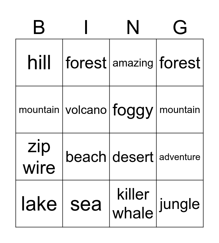 This bingo card has 19 words: desert, hotel, amazing, jungle, adventure, mountain, killer whale, hill, forest, zip wire, beach, volcano, foggy, sea, lake, cloudy, forest, mountain and hill.