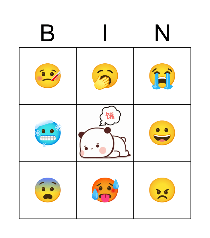 This bingo card has a free space and 8 words: 😀, ðŸ˜, 🥱, 😨, 🤒, 😠, 🥶 and 🥵.