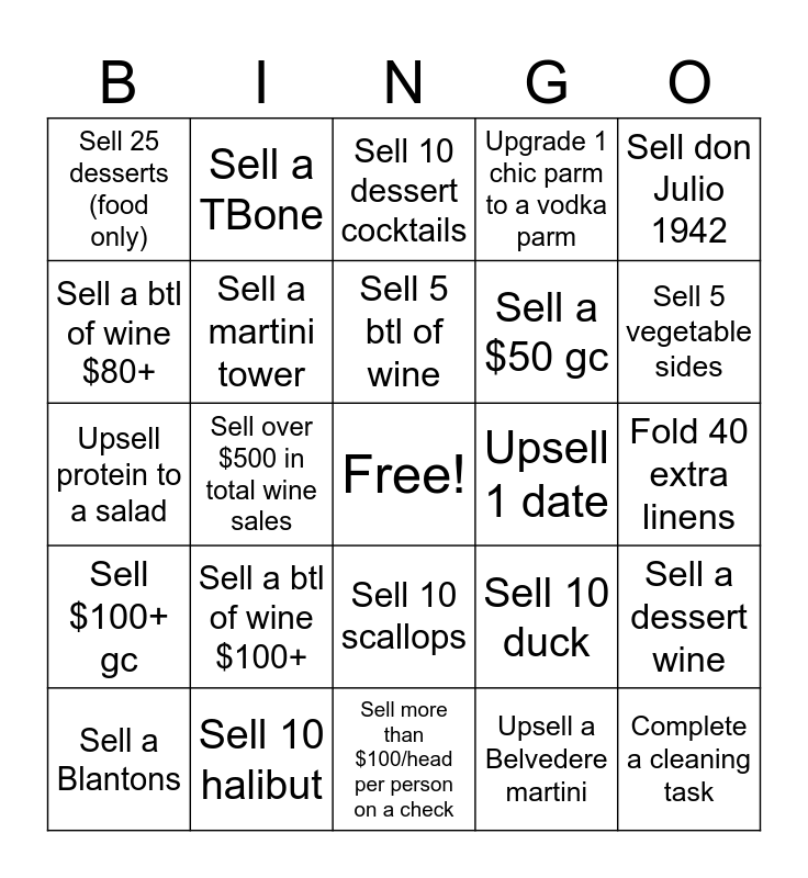 This bingo card has a free space and 24 words: Sell a btl of wine $100+, Sell 10 halibut, Sell 5 btl of wine, Sell a Blantons, Sell don Julio 1942, Sell 25 desserts (food only), Sell a btl of wine $80+, Sell a TBone, Upsell 1 date, Sell 10 scallops, Sell a $50 gc, Upsell protein to a salad, Sell 10 duck, Sell a dessert wine, Sell a martini tower, Upsell a Belvedere martini, Fold 40 extra linens, Sell 10 dessert cocktails, Sell 5 vegetable sides, Sell over $500 in total wine sales, Complete a cleaning task, Sell $100+ gc, Upgrade 1 chic parm to a vodka parm and Sell more than $100/head per person on a check.
