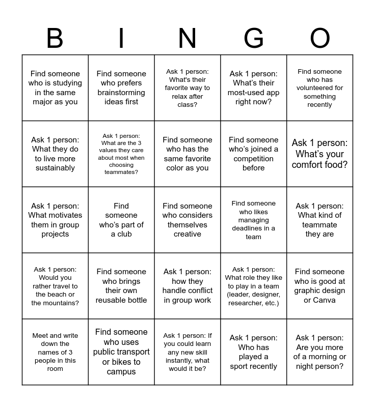 This bingo card has a free space and 24 words: Find someone who brings their own reusable bottle, Find someone who uses public transport or bikes to campus, Find someone who has the same favorite color as you, Meet and write down the names of 3 people in this room, Find someone who has volunteered for something recently, Find someone who is studying in the same major as you, Ask 1 person: What they do to live more sustainably, Find someone who prefers brainstorming ideas first, Find someone who likes managing deadlines in a team, Ask 1 person: how they handle conflict in group work, Find someone who’s joined a competition before, Ask 1 person: What motivates them in group projects, Ask 1 person: What role they like to play in a team (leader, designer, researcher, etc.), Find someone who is good at graphic design or Canva, Ask 1 person: What are the 3 values they care about most when choosing teammates?, Ask 1 person: Who has played a sport recently, Ask 1 person: What kind of teammate they are, Ask 1 person: What's their favorite way to relax after class?, Ask 1 person: What’s your comfort food?, Find someone who’s part of a club, Ask 1 person: Are you more of a morning or night person?, Ask 1 person: Would you rather travel to the beach or the mountains?, Ask 1 person: What’s their most-used app right now? and Ask 1 person: If you could learn any new skill instantly, what would it be?.