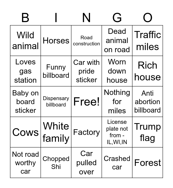 This bingo card has a free space and 24 words: White family, Chopped Shi, Car with pride sticker, Not road worthy car, Traffic miles, Wild animal, Loves gas station, Horses, Nothing for miles, Factory, Worn down house, Baby on board sticker, License plate not from - IL,WI,IN, Trump flag, Funny billboard, Crashed car, Anti abortion billboard, Road construction, Rich house, Dispensary billboard, Forest, Cows, Dead animal on road and Car pulled over.