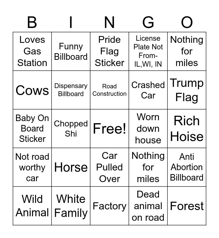 This bingo card has a free space and 24 words: Wild Animal, Horse, Road Construction, Dead animal on road, Nothing for miles, Loves Gas Station, Funny Billboard, Pride Flag Sticker, Worn down house, Rich Hoise, Baby On Board Sticker, Dispensary Billboard, Nothing for miles, Anti Abortion Billboard, Cows, White Family, Factory, License Plate Not From- IL,WI, IN, Trump Flag, Not road worthy car, Chopped Shi, Car Pulled Over, Crashed Car and Forest.