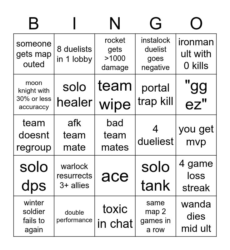 This bingo card has a free space and 36 words: lord stratagist, lord vangaurd, lord duelest, solo healer, solo tank, solo dps, team wipe, eaten by jeff, ironman ult with 0 kills, magneto ult with 0 kills, afk team mate, instalock duelist goes negative, duelist complains about heals, 4 dueliest, "gg ez", someone gets map outed, support with more damage then healing, warlock resurrects 3+ allies, wanda dies mid ult, rocket gets >1000 damage, you get mvp, 4 game loss streak, double performance, winter soldier fails to again, toxic in chat, 8 duelists in 1 lobby, team doesnt regroup, jeff kills a team member with his ult, portal trap kill, moon knight with 30% or less accuraccy, 3 team ups on 1 team, 4 ults at once, same map 2 games in a row, ace, bad lord and jeff does something.