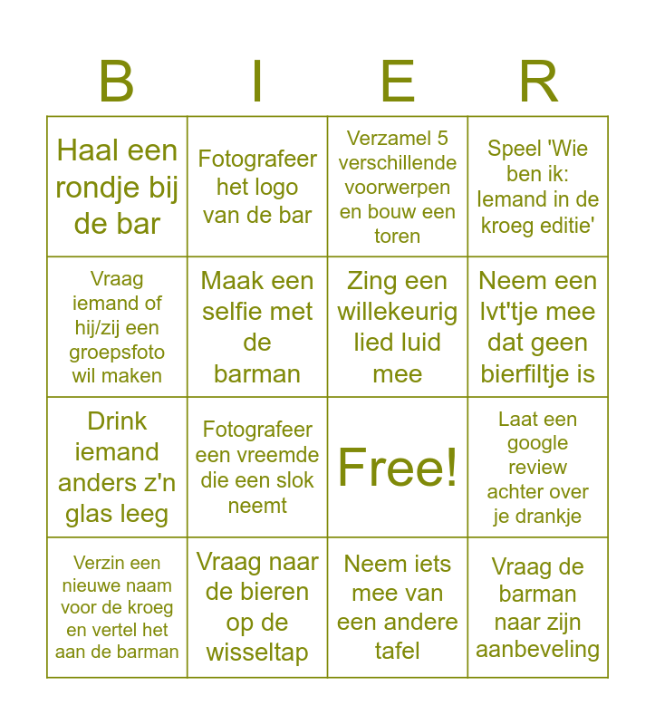 This bingo card has 19 words: Free!, Bots 'per ongeluk' tegen iemand aan, Verzamel 5 verschillende voorwerpen en bouw een toren, Vraag de barman naar zijn aanbeveling, Laat een google review achter over je drankje, Vraag iemand of hij/zij een groepsfoto wil maken, Neem iets mee van een andere tafel, Haal een rondje bij de bar, Fotografeer het logo van de bar, Drink iemand anders z'n glas leeg, Fotografeer een vreemde die een slok neemt, Maak een selfie met de barman, Zing een willekeurig lied luid mee, Vraag naar de bieren op de wisseltap, Verzin een nieuwe naam voor de kroeg en vertel het aan de barman, Speel een drankspelletje, Speel 'Wie ben ik: Iemand in de kroeg editie', Neem een lvt'tje mee dat geen bierfiltje is and Maak een toost met en op de barman.