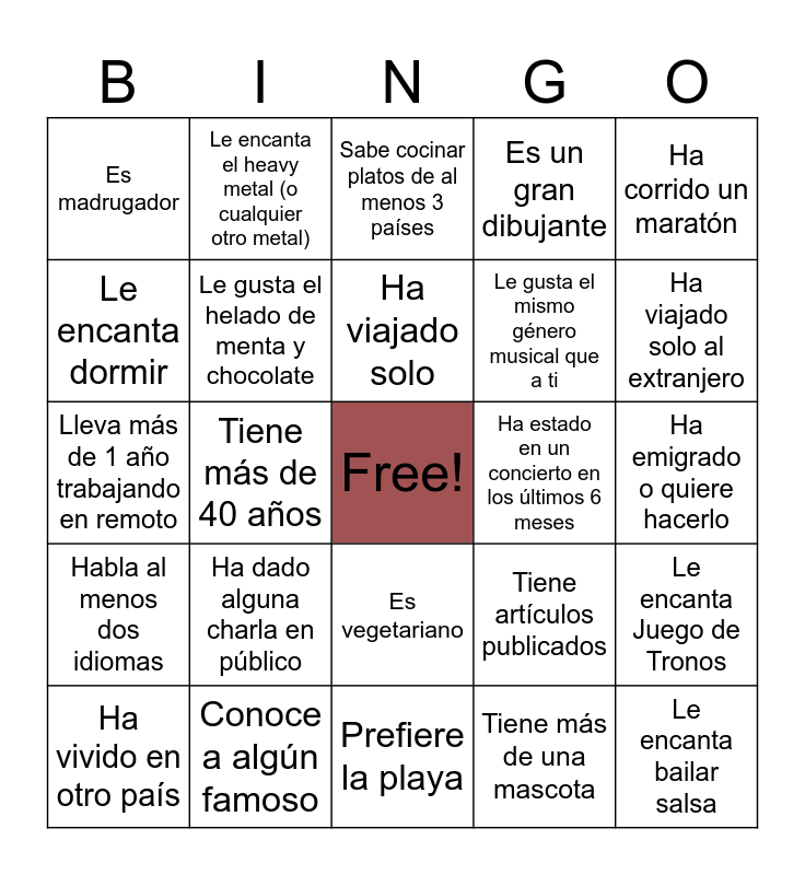 This bingo card has a free space and 34 words: Toca un instrumento musical, Tiene más de una mascota, Es ambidiestro, Adora las películas románticas, Habla al menos dos idiomas, Le gusta el helado de menta y chocolate, Ha corrido un maratón, Ha vivido en otro país, Le encanta el heavy metal (o cualquier otro metal), Practica algún deporte, Ha viajado solo, Sabe cocinar platos de al menos 3 países, Odia las series, Ha cambiado de carrera, Ha estado en un concierto en los últimos 6 meses, Ha viajado solo al extranjero, Conoce a algún famoso, Lleva más de 1 año trabajando en remoto, Ha dado alguna charla en público, Tiene artículos publicados, Es vegetariano, Prefiere la montaña, Es madrugador, Ha emigrado o quiere hacerlo, Prefiere la playa, Le encanta bailar salsa, Es un gran dibujante, Hace cosas con las manos: costura, carpintería, etc, Le gusta el mismo género musical que a ti, Le encanta dormir, Tiene menos de 30 años, Tiene más de 40 años, Le encanta Juego de Tronos and No le gusta ver películas.