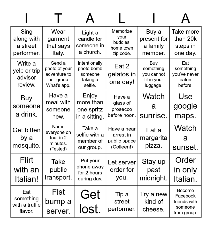 This bingo card has 36 words: Let server order for you., Put your phone away for 2 hours during day., Tip a street performer., Write a yelp or trip advisor review., Get bitten by a mosquito., Have a glass of prosecco before noon., Send a photo of your adventure to our group What’s app., Get lost., Buy a present for a family member., Stay up past midnight., Eat something you’ve never eaten before., Memorize your buddies’ home town zip code., Order in only Italian., Have a meal with someone new., Eat 2 gelatos in one day!, Sing along with a street performer., Flirt with an Italian!, Watch a sunrise., Buy someone a drink., Light a candle for someone in a church., Enjoy more than one spritz in a sitting., Name everyone on tour in 2 minutes. (Tested), Have a near arrest in public space (Colleen!), Take a selfie with a member of our group., Eat a margarita pizza., Wear garment that says Italy., Buy something you cannot fit in your luggage., Fist bump a server., Intentionally photo bomb someone taking a selfie., Take more than 20k steps in one day., Become Facebook friends with someone from group., Eat something with a truffle flavor., Watch a sunset., Use google maps., Take public transport. and Try a new kind of cheese..