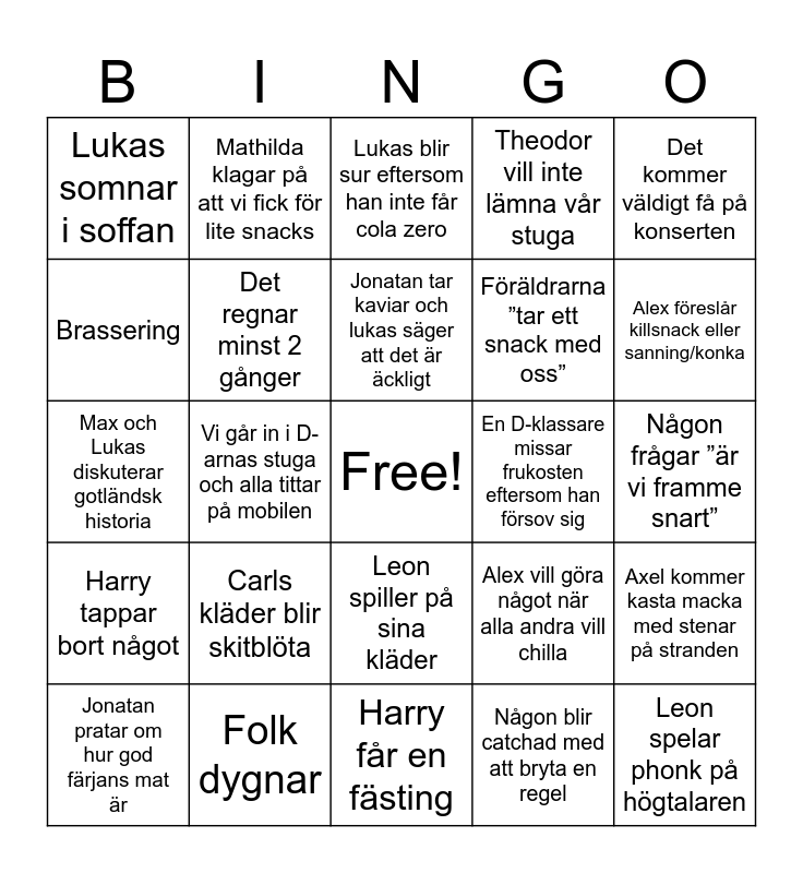 This bingo card has a free space and 24 words: Carls kläder blir skitblöta, Folk dygnar, Jonatan tar kaviar och lukas säger att det är äckligt, Jonatan pratar om hur god färjans mat är, Det kommer väldigt få på konserten, Lukas somnar i soffan, Brassering, Mathilda klagar på att vi fick för lite snacks, En D-klassare missar frukosten eftersom han försov sig, Leon spiller på sina kläder, Föräldrarna ”tar ett snack med oss”, Max och Lukas diskuterar gotländsk historia, Alex vill göra något när alla andra vill chilla, Axel kommer kasta macka med stenar på stranden, Det regnar minst 2 gånger, Någon blir catchad med att bryta en regel, Någon frågar ”är vi framme snart”, Lukas blir sur eftersom han inte får cola zero, Alex föreslår killsnack eller sanning/konka, Vi går in i D-arnas stuga och alla tittar på mobilen, Leon spelar phonk på högtalaren, Harry tappar bort något, Theodor vill inte lämna vår stuga and Harry får en fästing.