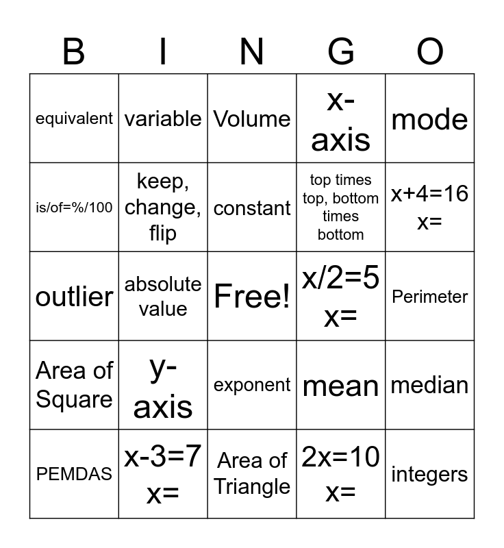 This bingo card has a free space and 24 words: y-axis, x-3=7 x=, constant, PEMDAS, mode, equivalent, is/of=%/100, variable, x/2=5 x=, exponent, top times top, bottom times bottom, outlier, mean, median, keep, change, flip, 2x=10 x=, Perimeter, Volume, x+4=16 x=, absolute value, integers, Area of Square, x-axis and Area of Triangle.