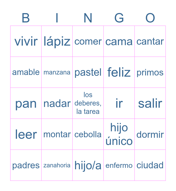 This bingo card has 40 words: verduras, pan, fresa, manzana, zanahoria, cebolla, pastel, refresco, cantar, leer, nadar, cama, los deberes, la tarea, salir, ir, montar, beber, vivir, escribir, comer, dormir, enfermo, feliz, amable, antipático, escuchar, fuerte, débil, ciudad, barrio, móvil, padres, abuelos, hijo único, primos, hijo/a, cuaderno, mochila, lápiz and bolígrafo.