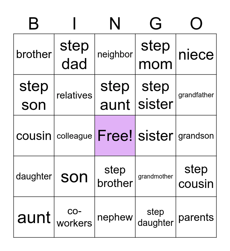 This bingo card has a free space and 29 words: aunt, grandparents, colleague, grandma, brother, neighbor, relatives, son, sister, co-workers, grandson, parents, nephew, step daughter, grandfather, uncle, step brother, daughter, niece, cousin, grandmother, grandpa, step sister, step son, step mom, step dad, step cousin, step aunt and step uncle.