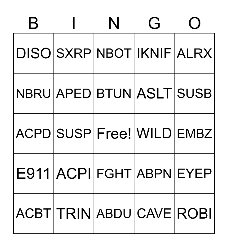 This bingo card has a free space and 24 words: ACPI, TRIN, BTUN, ACBT, ALRX, DISO, NBRU, SXRP, WILD, FGHT, ASLT, ACPD, ABPN, EYEP, APED, CAVE, EMBZ, NBOT, SUSB, SUSP, ROBI, E911, IKNIF and ABDU.