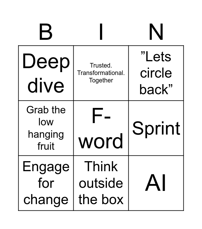 This bingo card has a free space and 8 words: Sprint, ”Lets circle back”, Trusted. Transformational. Together, Engage for change, Deep dive, AI, Grab the low hanging fruit and Think outside the box.